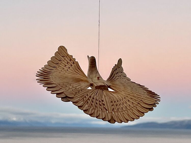During Alta Museum’s one year long war memorial commemoration, several objects will be on display in our café. As part of this small exhibition, peace birds will also float from the ceiling. These peace birds, as we call them, have gone by several names, such as Lykkefuglen (the lucky bird) or Pomorduen (the Pomor dove). Many of them originate from the northernmost regions of the European part of Russia. The birds are made of two profiled wooden pieces joined in a cross shape, with wings and tail created by splitting the wood into thin shavings that spread out and interlock. Old stories from northern Russia tell that such birds hung from the ceilings of every Pomor home. The peace bird served as a lucky charm, believed to bring peace and prosperity to the household. During World War II, many Soviet prisoners of war were held in camps in Norway. As a token of gratitude for the food and help they received from the locals, they gifted them such birds.