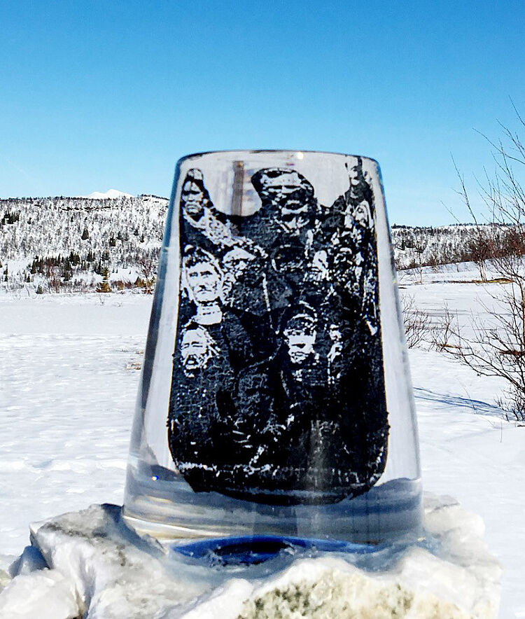 Kunstverket som er avbildet i ovenfor er laget av Tomas Colbengtson, med tittel «De som reiste, De som tog emot.» Kunstneren selv beskriver verket slik: «Øverfangsglass silketrykk. Størrelse av glassgåtie 31 cm høy og 24 cm diameter i basen. Glassgåetien av sørsamisk modell synliggør tidigare generationer som levt och verkat i Västerbotten och i glasset finnes nordsamiska familjer opprinnligt fra Troms men som blev nødd att flytte. Glasset står på bergskristall som tidigare bruktes som seite da kristallen säga ha magiska egenskaper. Bergskristall i dess renaste form är glass.»